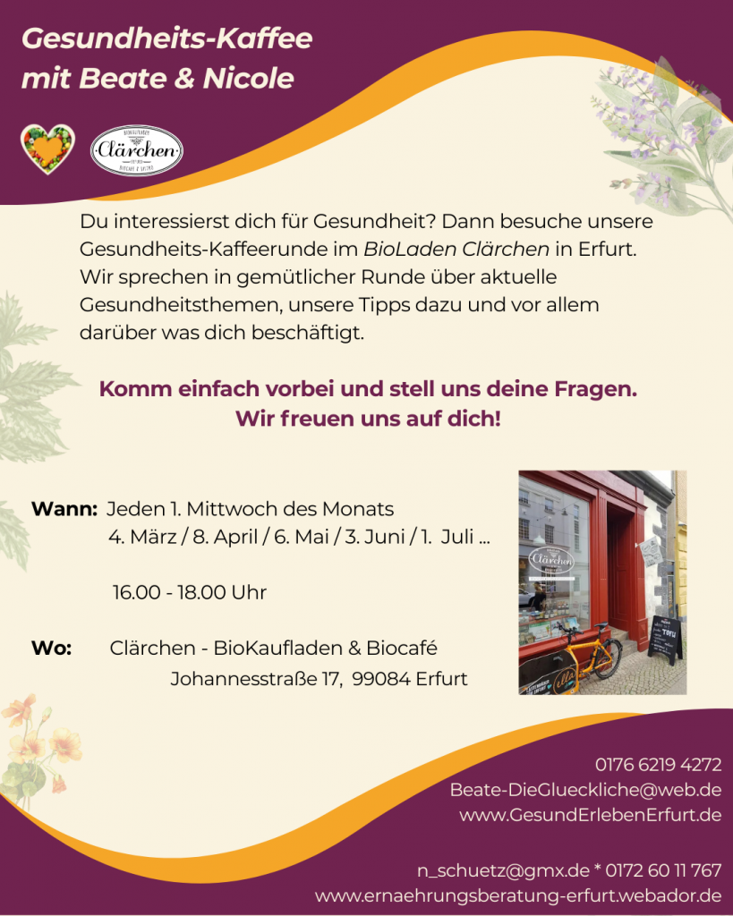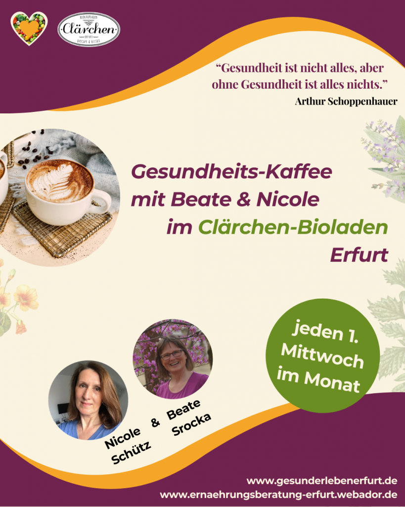 Besuche mich zu meiner Gesundheits-Kaffeerunde, zu der ich gemeinsam mit Nicole Schütz jeden 1. Mittwoch im Monat im Clärchen-Biolade einlade.
